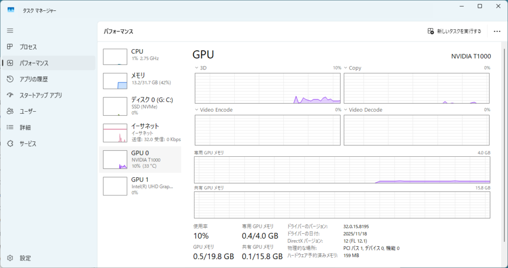 「Ctrl」+「Shift」+「Esc」を押すと、タスクマネージャーが表示されます。タスクマネージャーを開き、パフォーマンスを選択すると、右上にGPUの名前が表示されます。