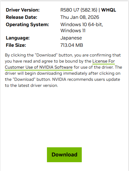 NVIDIA製のGPUを使用するためには、NVIDIA製のGPUをサポートしたGPUドライバをインストールします。GPUドライバはコンピュータのOSとGPU(グラフィックボード)の間に入って、通訳の役割を果たすソフトウェアのことです。GPUは画像処理に特化した非常に強力なハードウェアですが、OSやアプリケーションは、そのままではGPUをどう動かせばよいか正確な命令を出すことができません。そこで、ドライバーという橋渡し役が必要になります。