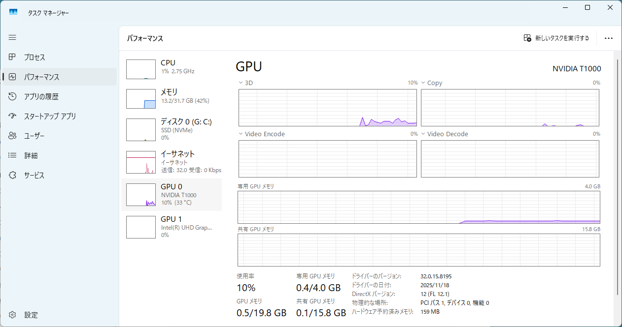 「Ctrl」+「Shift」+「Esc」を押すと、タスクマネージャーが表示されます。タスクマネージャーを開き、パフォーマンスを選択すると、右上にGPUの名前が表示されます。
