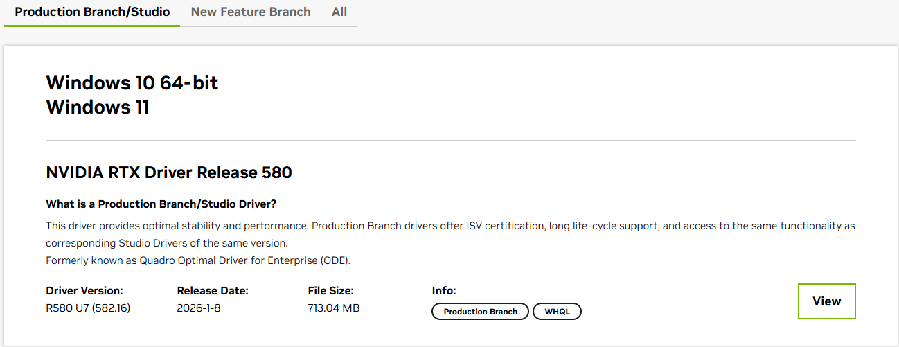 インストール可能なドライバー一覧が表示されるので、インストールするドライバー(通常は最新版)のところに記載されている【View】をクリックします。