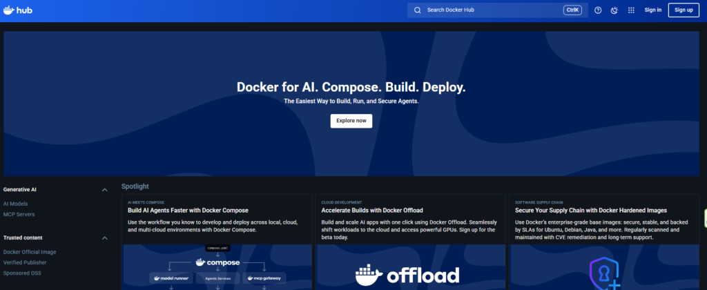 世界中で最も使われているイメージ配布サイトで、Ubuntu、Nginx、PostgreSQLなどの公式イメージが提供されています。