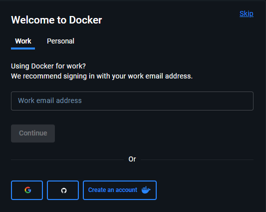 Docker Desktopを実行すると、「Docker Subscription Service Agreement」が開かれます。これは有料サブスクリプションサービスに関する承認を求めるものです。