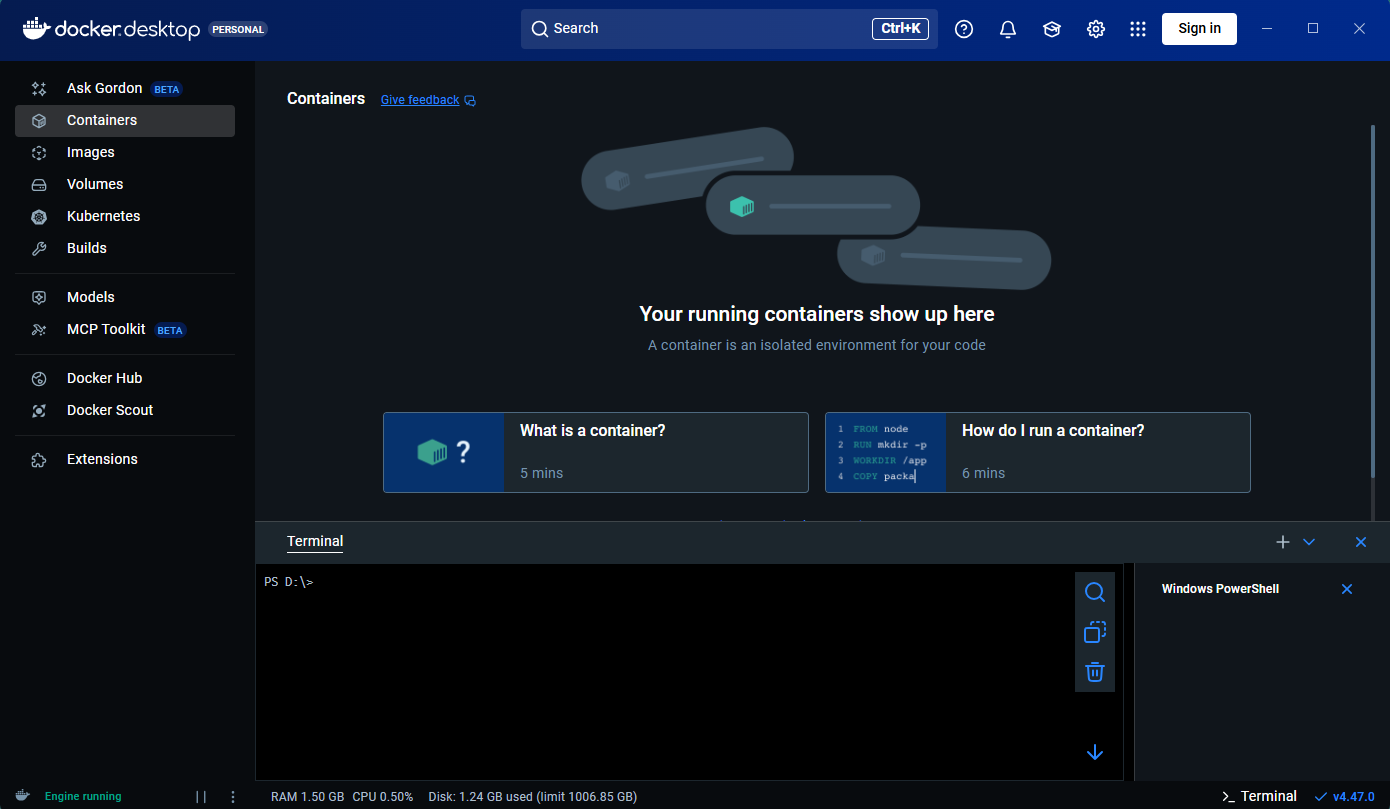 Docker Desktopは常駐アプリで、タスクバーに表示されます(クジラのようなマークです)。軽いので常駐させていてもPCの動作にはほとんど影響はありません。