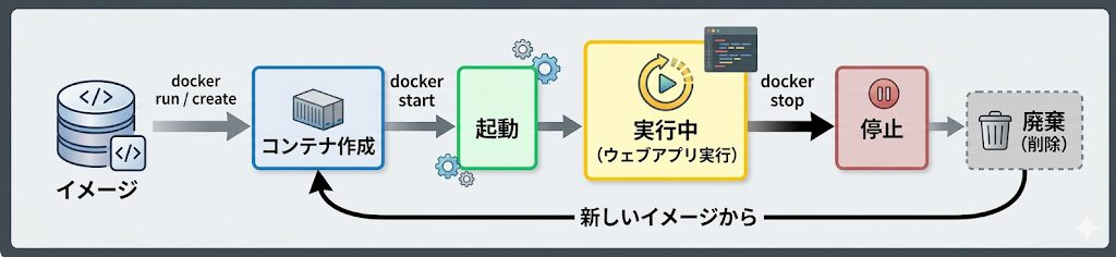 コンテナはイメージから作り直す方が便利であるため、「イメージから作成」→「起動」→「停止」→「廃棄」がライフサイクルとなっており、コンテナを使い捨てるのが基本的な使い方です。