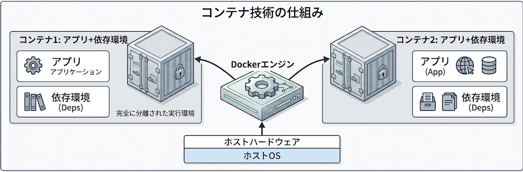 プログラムとその動作環境をまとめて入れるための「箱」であるコンテナを使用し、それぞれのコンテナ内で使うライブラリや設定がお互いに影響しないように隔離します。